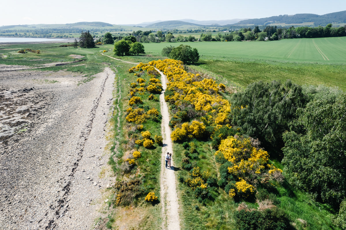 A drone shot at height of a young couple holding hands while, standing on a path, surrounded by yellow gorse, next to the sea